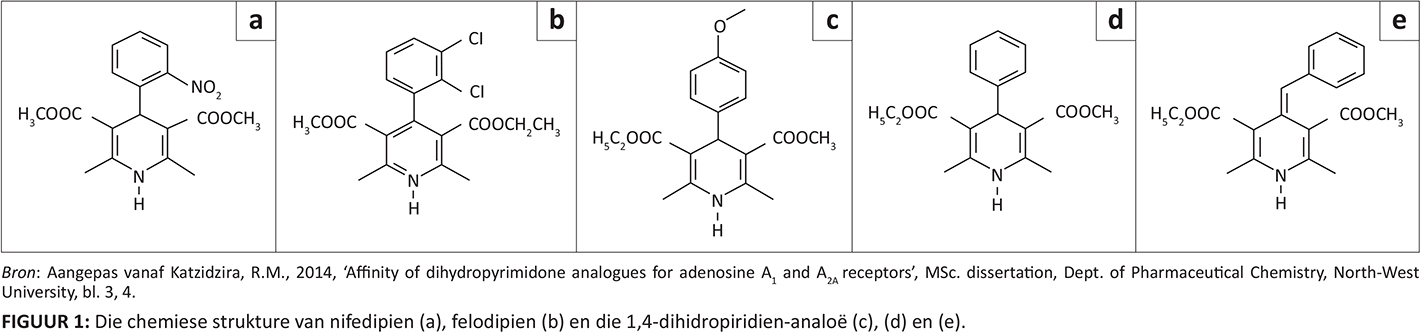 FIGUUR 1: Die chemiese strukture van nifedipien (a), felodipien (b) en die 1,4-dihidropiridien-analoë (c), (d) en (e). |