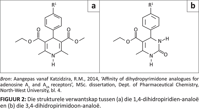 1,4-Dihidropiridienderivate (1,4-DHP) is as aktiewe L-tipe kalsiumkanaalremmers en -aktiveerders ontwikkel. Party van hierdie kalsiumkanaalblokkeerders word vir die behandeling van hipertensie en koronêre hartsiektes gebruik (Borchard 1994). Strukturele veranderings aan 1,4-DHP het tot aktiwiteit van hierdie verbindings vir ander geneesmiddelteikens gelei, byvoorbeeld binding aan α1a-adrenergiese reseptore en plaatjiegeaktiveerde faktorreseptore (Wetzel et al. 1995; Sunkel et al. 1990). Daarbenewens besit verskeie dihidropiridienderivate ook affiniteit vir adenosien A1-reseptore in die rotbrein (Fredholm, Hu & Lindgren 1986; Hu et al. 1987). Nifedipien (Figuur 1a) en felodipien (Figuur 1b) is twee dihidropiridien-kalsiumkanaalantagoniste met dissosiasiekonstante-waardes (Ki-waardes) van 4.2 μM en 8.7 μM respektiewelik vir die adenosien A1-reseptor (Hu et al. 1987). Verskeie dihidropiridienderivate is voorheen deur Van Rhee en medewerkers (1996) gesintetiseer en daar is gevind dat hierdie verbindings affiniteit toon vir die adenosien A1-, A2A- en A3-reseptore in rotbreine. Laasgenoemde studie het aangetoon dat die para-gesubstituteerde metoksiederivaat (Figuur 1c) die beste adenosien A1-affiniteit besit (A1Ki = 2.75 μM), dat die ongesubstitueerde 4-fenielverbinding (Figuur 1d) die hoogste adenosien A2A-affiniteit besit (A2AKi = 2.74 μM) en dat die 4-trans-sterielderivaat (Figuur 1e) ’n ideale leidraadverbinding vir adenosien A3-affiniteit is (A3Ki = 0.67 μM) (Figuur 1). Na aanleiding van die bevindinge dat 1,4-DHP affiniteit vir adenosienreseptore toon, het die huidige studie ’n reeks struktureelverwante 3,4-dihydropirimidoon-analoë as potensiële adenosien A1 en A2A antagoniste ondersoek (Figuur 2).