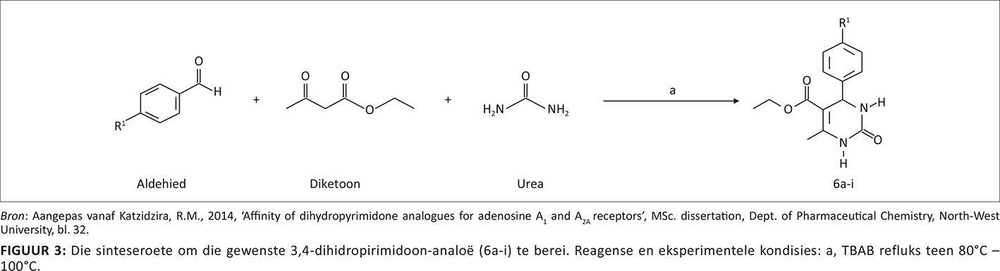 ’n Biginelli-eenpotsintese is gebruik om die teikenstrukture (6a-i) onder oplosmiddelvrye kondisies te berei (Kadre et al. 2012). In kort, ’n mengsel van β-diketoon (10 mmol), aldehied (10 mmol), urea (10 mmol) en tetra-butiel-ammoniumbromied (TBAB; 0.05 g, 1.5 M) is vir ’n geskikte tyd by 80–100 °C onder refluks gekook. Die reaksie is deur middel van dunlaag-chromatografie gemoniteer. Nadat die reaksie volledig verloop het, is die produk gefiltreer en gewas met water (3 mL x 10 mL) om van die TBAB ontslae te raak. Daarna is die produk vanuit etanol gerekristalliseer om die gewenste 3,4-dihidropirimidoon-analoë, met ’n goeie opbrengs, te verkry, (Figuur 3). Elke gesintetiseerde teikenverbinding se struktuur is deur 1H KMR, 13C KMR en massaspektrometrie geverifieer. Die strukture is ook bevestig deur die KMR-data met ooreenstemmende literatuurdata te vergelyk (Kadre et al. 2012; Heravi, Derikvand & Bamoharram 2005; Kalita & Phukan 2007; Ma et al. 2000).