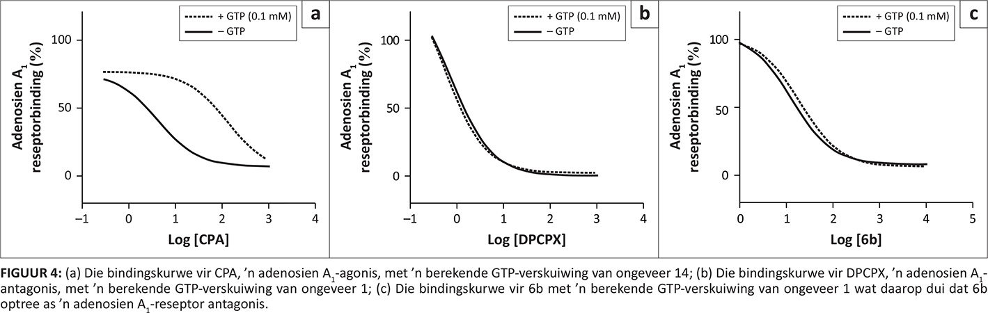 FIGUUR 4: (a) Die bindingskurwe vir CPA, ’n adenosien A1-agonis, met ’n berekende GTP-verskuiwing van ongeveer 14; (b) Die bindingskurwe vir DPCPX, ’n adenosien A1-antagonis, met ’n berekende GTP-verskuiwing van ongeveer 1; (c) Die bindingskurwe vir 6b met ’n berekende GTP-verskuiwing van ongeveer 1 wat daarop dui dat 6b optree as ’n adenosien A1-reseptor antagonis. |