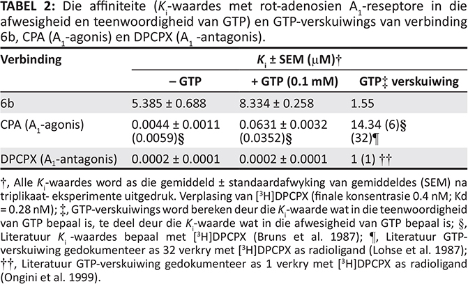 Funksionele karakterisering van verbinding 6b en twee verwysingsverbindings, DPCPX en CPA, is deur middel van ’n GTP-verskuiwingstoets gedoen. Die GTP-verskuiwingstoets is in triplikaat met kortikale rotmembrane uitgevoer, soos voorheen beskryf (Van der Walt & Terre’Blanche 2015). Die affiniteite is met 0.4 nM [3H]DPCPX, as radioligand, in die afwesigheid en teenwoordigheid van 0.1 mM guanosientrifosfaat (GTP) bepaal. ’n Opsomming van die resultate word in Tabel 2 gegee.