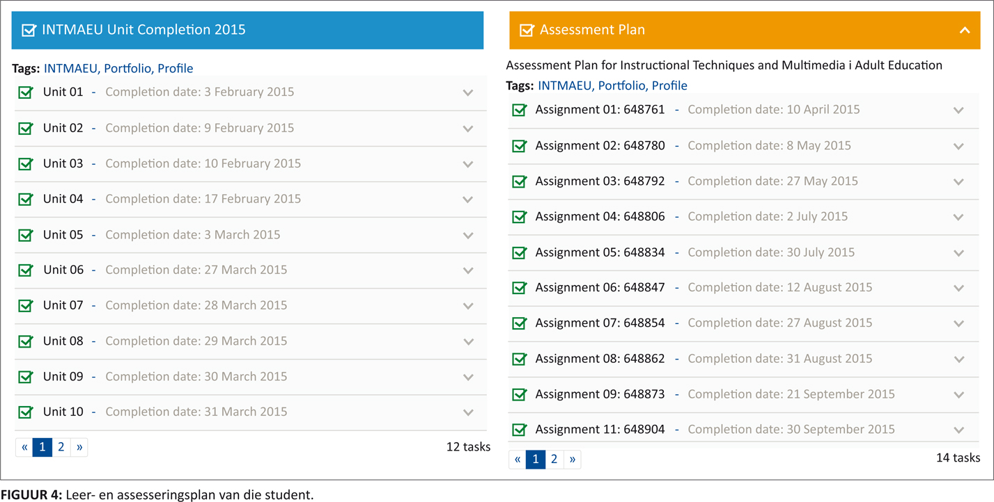 Afstandonderwys is op die idee gebaseer dat leerders selfregulerend is, tog word lae sukses- en hoë uitvalsyfers aan ontoereikende selfregulering toegeskryf. Selfregulerende leer en tydperspektiewe is ’n belangrike aanduider van akademiese sukses. Volgens Keyser (2013:69) stel studente met ’n toekomsperspektief doelstellinge en is hulle gemotiveerd om dade en strategieë te reguleer om die gestelde doelstellings te bereik. Daarom word die aanname gemaak dat sodanige studente akademies sal presteer. Die staat vereis dat selfreguleringsvaardighede tydens tersiêre onderwys ontwikkel word, daarom is geleenthede vir selfregulering geskep. Die studente is aangemoedig om die beplanningsfunksie van Mahara te gebruik om eie doelstellings te stel. Volgens Zimmerman (2002:69) oefen die stel van eie doelstellings ’n positiewe invloed op motivering en sukses uit. Die student se leer- en assesseringsplan word in Figuur 4 voorgestel.