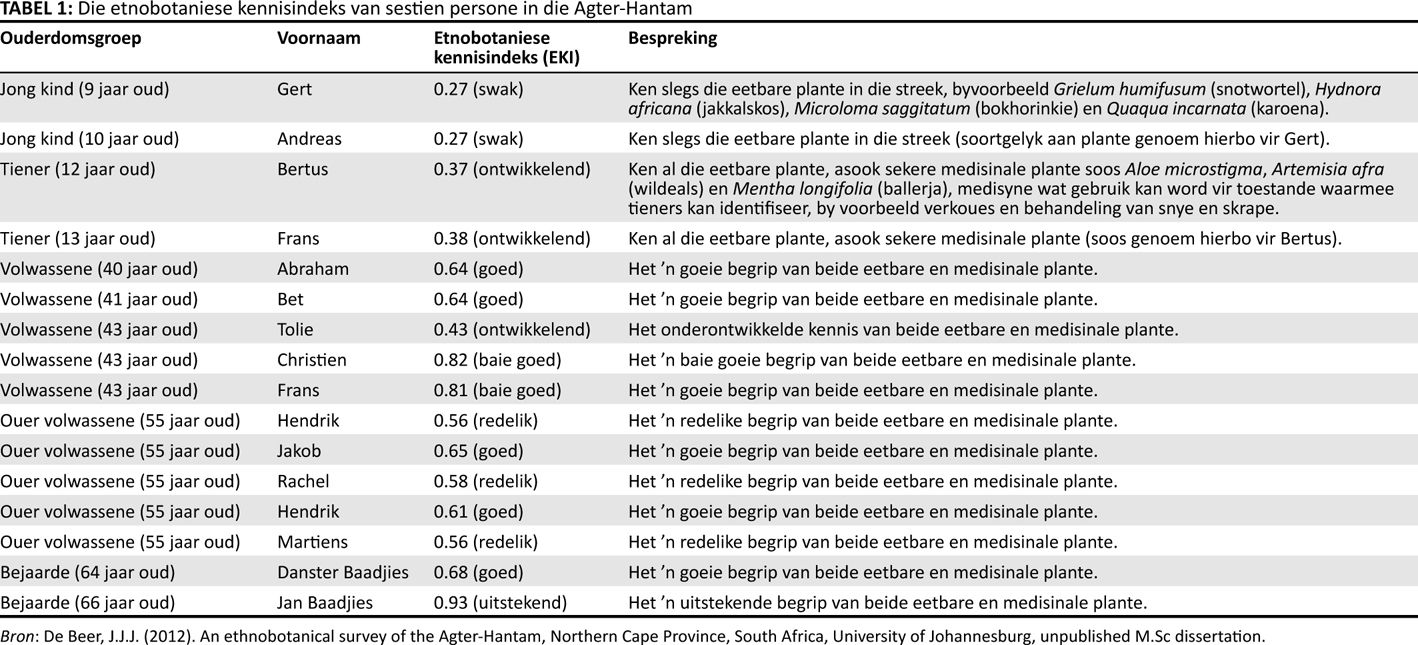 Die fokus in hierdie artikel is egter op hoe die leer in die gemeenskap plaasvind. De Beer (2012) wou tydens sy navorsing vasstel of inheemse kennis na die jonger geslag oorgedra word. In die steekproef in die Agter-Hantam is die etnobotaniese kennis van mense van verskeie ouderdomme gemeet. De Beer en Van Wyk (2011) het die etnobotaniese kennisindeks (EKI) ontwikkel. Die EKI meet ’n persoon se kennis van plantgebruike en dui dit op ’n indeks aan, waar 1.0 ’n perfekte kennis van plantgebruike voorstel, en 0 aandui dat die persoon oor geen kennis ten opsigte van plantgebruik beskik nie. Wat interessant was, was dat kinders in die gemeenskap hoofsaaklik die eetbare plante geken het, maar nie goed ingelig was oor medisinale plantgebruike nie. Ouer mense in die gemeenskap het weer ’n goeie kennis van medisinale plante gehad, en dit is weerspieël in die indekswaardes ten opsigte van hulle etnobotaniese kennis (sien Tabel 1).