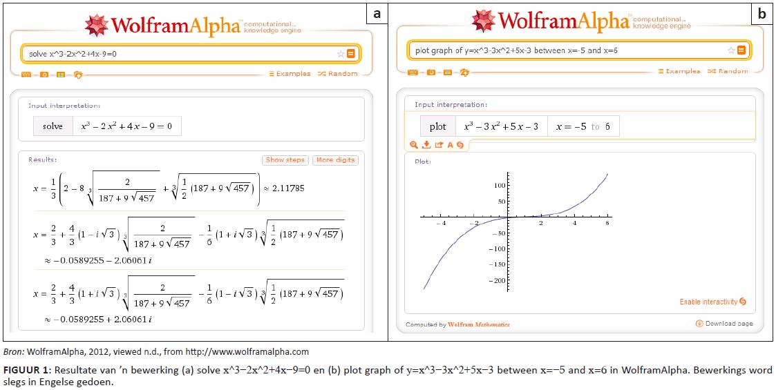 FIGUUR 1: Resultate van ’n bewerking (a) solve x^3-2x^2+4x-9=0 en (b) plot graph of y=x^3-3x^2+5x-3 between x=-5 and x=6 in WolframAlpha. Bewerkings word slegs in Engelse gedoen.