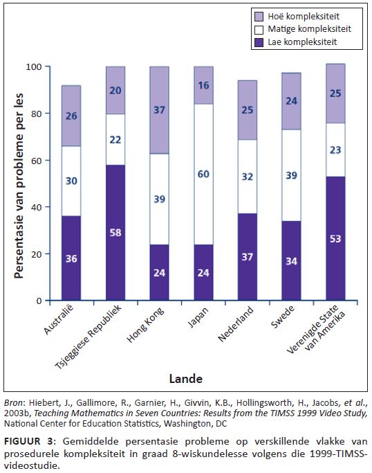 Die Japannese onderwysers wy nie net meer tyd aan ‘nuwe’ werk nie, hulle wy ook meer tyd aan moeiliker werk. In Figuur 3 is dit duidelik dat Japan persentasiegewys baie meer probleme doen wat hoërordedenke vereis as die meeste ander skole in die wêreld. Waar Japan 17% van die tyd aan eenvoudige probleme wy, wy die VSA 67% van die klastyd aan hierdie probleme. In die geval van komplekse probleme wy Japan 39% van die klastyd daaraan, teenoor die VSA se 6% (sien Figuur 3).