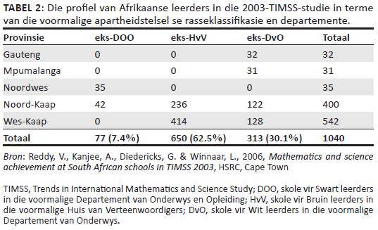 Volgens Reddy et al. (2006) is die 2003-TIMSS-studie se data in November 2002 in Suid-Afrika ingesamel. Hulle verduidelik verder dat die steekproef wat 255 skole en 8952 leerders ingesluit het, eerstens per provinsie en daarna per taal bepaal is (Reddy et al. 2006). Die leerders kon die toets in Afrikaans of Engels voltooi. In die RGN-verslag het Reddy et al. (2006) die data ook in terme van die voormalige apartheidstelsel se rasseklassifikasie en onderwysdepartemente ontleed:There were 952 cases. Of these, 6 697 learners were in ex-DET schools (previously for African learners); 1 211 learners were in ex-HoR schools (previously for coloured learners); 303 learners were in ex-HoD schools (previously for Indian learners), and 741 learners were in ex-HoA schools (previously for white learners). Although the numbers for ex-HoD and ex-HoA schools are low, the scores can be considered as indicative of performance in these schools. [Daar was 952 gevalle. Hiervan was 6 697 leerders in eks-DOO-skole (voorheen vir Swart leerders), 1 211 leerders was in eks-HvH-skole (voorheen vir bruin leerders), 303 leerders was in eks-HvD-skole (voorheen vir Indiërleerders), en 741 in eks-DvO-skole (voorheen vir wit leerders). Hoewel die getalle vir eks-HvD- en eks-DvO-skole klein is, kan die tellings as aanwysers van die prestasie in dié skole beskou word.] (bl. 50, [outeur se eie vertaling]) Die eks-DOO-skole verwys na die skole vir Swart leerders in die voormalige Departement van Onderwys en Opleiding, terwyl die eks-HvV na die skole vir Bruin leerders in die voormalige Huis van Verteenwoordigers verwys, die eks-HvD na skole vir Indiërleerders in die voormalige Huis van Afgevaardigdes, en laastens die eks-DvO na die skole vir Wit leerders in die voormalige Departement van Onderwys. Al hierdie skole is tans oop vir alle rasse, maar ’n Wit leerling sal selde in ’n voormalige Swart of Bruin skool aangetref word, terwyl die teenoorgestelde nie ongewoon is nie. Die profiel van die Afrikaanse leerders wat aan die studie deelgeneem het, word in Tabel 2 verduidelik. Die rede waarom Tabel 2 en Tabel 3 nie die eks-HvD-skole insluit nie, is omdat daar geen leerders in daardie skole was wat die toetse in Afrikaans afgelê het nie.