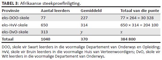 redelike akkuraatheid bereken word. Reddy et al. (2006, Tabel 5.3) meld in die RGN-verslag dat die gemiddelde prestasie van die leerders in die eks-DOO-skole 227 en in die eks-HvV-skole 314 was. Die aanname in Tabel 3 is dat die leerders in die eks-HvV-skole dieselfde gemiddeld handhaaf in verskillende steekproewe. Die populasiegrootte van die leerders in eks-HvV-skole regverdig so ’n aanname want die steekproefgrootte van al die leerders in die eks-HvV-skole is N = 1211, terwyl meer as die helfte (N = 650) hiervan ook in die Afrikaanse steekproef in Tabel 2 ingesluit is (Reddy et al. 2006, Tabel 5.3). Die tweede aanname is dat die 77 leerders wat die toets in Afrikaans afgelê het in die eks-DOO-skole dieselfde gemiddeld handhaaf as alle leerders in Suid-Afrika, wat 264 was.