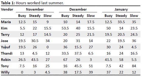 During the last summer holidays Maya started a concession business at Wild Days Amusement Park. Her vendors roam the park with popcorn and drinks for sale. Maya needs help deciding whom to rehire next summer.Last year Maya had nine vendors. This summer, she is only able to employ six – three full-time and three half-time. She wants to rehire only the most successful vendors, but she doesn’t know how to compare them because of unequal shift lengths. Also, when they worked, makes a big difference. After all, sales would peak on a crowded Friday night and dip on a rainy afternoon. Maya reviewed her records from last year. For each individual vendor, she totalled the number of working hours and the money collected – when business in the park was good (high attendance), steady, and slow (low attendance) (see Table 1 and Table 2). Please evaluate how well the various vendors did for the business last year and choose three she should rehire full-time, and three half-time. Write a letter to Maya giving your results. In your letter describe how you evaluated the vendors. Give details so Maya can check your work; do give a clear explanation so she can decide whether your method is efficient.
