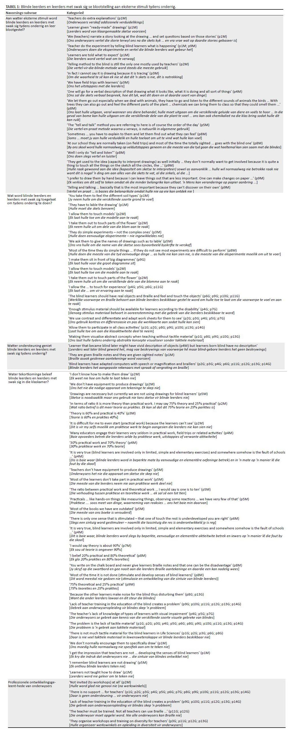 die onderrig van lewenswetenskappe aan blinde leerders en leerders met swak sig verreken word. Die sekondêre analise bevestig dat blinde leerders selde aan
