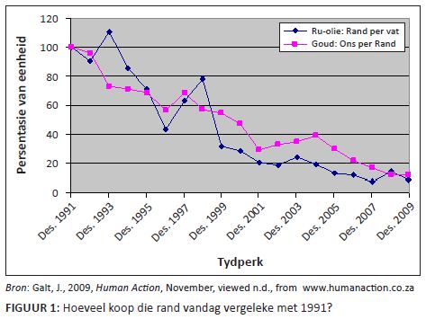 Hierdie publikasie (Cameron 2004) behandel verskeie aspekte van die persoonlike en finansiële kwellings van afgetredenes. Dit bevat egter weinig advies, benewens finansiële advies, om te verseker dat afgetredenes in aftreeoorde woon wat volhoubare dienste verskaf. Daar word wel waardevolle waarskuwings gerig oor beleggingsrisiko’s, herverkoop, heffings, swak bestuur, finansiële kwellings, gesondheidsorg en ander ondersteuning. Cameron (2004:272) waarsku: ‘The retirement village industry has not had a very satisfactory history in South Africa.’ [Die aftreeoordindustrie in Suid-Afrika het nie ’n baie bevredigende geskiedenis nie.] Die allesoorheersende bekostigbaarheidkrisis op die lang termyn wat indringend ondersoek moet word, word gedemonstreer deur die volgende uittreksel uit ’n artikel op die Human Action webwerf deur Galt (November 2009). Die rand het 90% van sy koopkrag sedert 1991 verloor. Figuur 1 toon hierdie rampspoedige verskynsel duidelik.