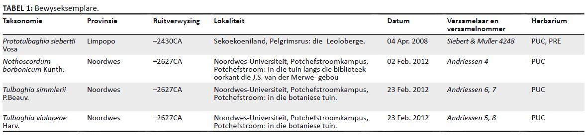 Tuin verkry is. (Sien Tabel 1: Bewyseksemplare)