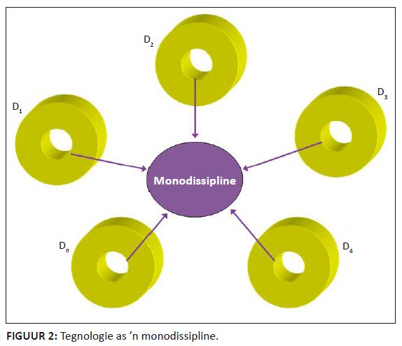 Voortspruitend uit Trümpelmann se definisie van vakdidaktiek sou daar gevra kan word na die aard en wese van die akademiese dissipline wat tegnologie as skoolvak ten grondslag lê (Ropohl 1997:71), veral in die lig daarvan dat dit vroeër gestel is dat tegnologie as vak, anders as ander skoolvakke, nie so ’n ekwivalente dissipline het nie. Het ons nie dalk hier met ’n illusie van ’n skoolvak te make, wat reeds geïmplementeer is en daarop aanspraak maak dat dit tegnologie as kenbare het, en nie verwesentlik kan word nie, aangesien dit nie op ’n akademiese dissipline berus nie?Dit is belangrik vir die argument om daaraan herinner te word dat die ander vakmetodologieë histories op ’n enkele akademiese dissipline gebaseer is, byvoorbeeld die vakmetodologie van geskiedenis op geskiedenis as dissipline. Die outeur verwys na hierdie tradisionele soort begronding as monodissiplinêr. Met inagneming van die feit dat daar konseptuele kennis uniek aan tegnologie is (McCormick 1997:153), moet aanvaar word dat daar tog ’n akademiese begronding is. McCormick (1997) sê voorts: Such knowledge of how objects are made (procedural), or how they work (conceptual process knowledge) is not the stuff of science and mathematics textbooks or lessons, though we make an attempt at many levels of education to pretend it is. [Sulke kennis van hoe voorwerpe gemaak word (prosedurekennis), of hoe hulle werk (konseptuele proseskennis) is nie die inhoud van natuurwetenskap- en wiskundekhandboeke of lesse nie, alhoewel ons op verskillende onderwysvlakke poog om voor te gee dat dit die geval is] (bl. 144 [outeur se eie vertaling]). En: ‘Technical knowledge in totality is extensive and manifold’ [Tegniese kennis in sy geheel is omvattend en uiteenlopend’] (Ropohl 1997:71 [outeur se eie vertaling]). Die rede waarom mense beweer dat tegnologie as vak nie soos ander skoolvakke ’n eie akademiese dissipline het nie, is moontlik daarin opgesluit dat die akademiese dissipline waarop dit berus, as gevolg van die omvang daarvan, asook die wyse waarop dissiplines tans aan hoëronderwysinstellings gestruktureer is, as komponente binne meer as een van die bestaande dissiplines manifesteer. Die onderliggende dissipline is tans moontlik nog ’n multidissipline ofte wel ’n polidissipline (waarvan komponente oor meer as een dissipline verspreid lê, D1 – Dn, soos