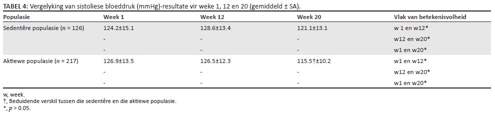 Wanneer sistolies BD vergelyk word (Tabel 4), sien ons ’n geleidelike daling in die resultate van die aktiewe populasie vanaf week 1 tot week 2, terwyl dié vir die sedentêre populasie gedurende week 12 ’n hoogtepunt bereik het. Sistoliese BD (Tabel 4) het beduidend gedaal in die aktiewe populasie vanaf weke 1 tot 20. Diastoliese BD (Tabel 5) het in albei populasies ’n daling getoon, maar in ’n groter mate in die aktiewe populasie.