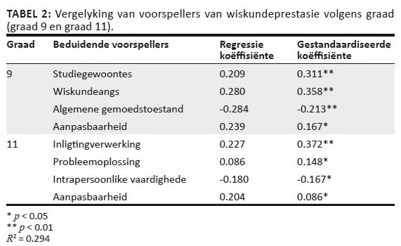 TABLE 2: Vergelyking van voorspellers van wiskundeprestasie volgens graad