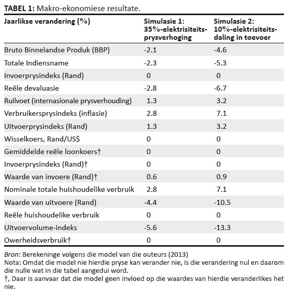 Cameron en Naudé het in 2008 geskat dat die verbruik van elektrisiteit op daardie tydstip met 10% moes daal ten einde ewewig tussen vraag en aanbod van elektrisiteit te verkry. Dit kon bereik word deur eenvoudig die elektriese toevoer met tye af te sny, of om volgens hul skatting die prys van elektrisiteit met 35% te verhoog. Om daardie rede word daar in ons navorsing op hierdie twee voorspellings gefokus. Die resultate van die algemene ewewigsmodellering word vervolgens ooreenkomstig die makro-ekonomie, die invloed op nywerheidsektore en laastens die invloed op huishoudings opgesom.
