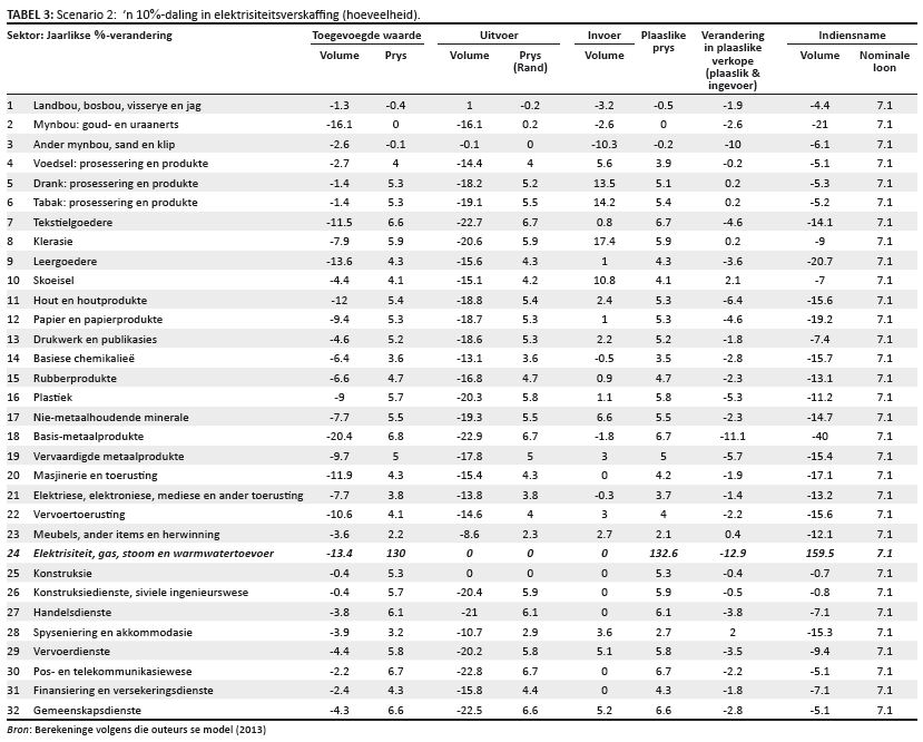 TABLE 3: Scenario 2: ’n 10%-daling in elektrisiteitsverskaffing (hoeveelheid).