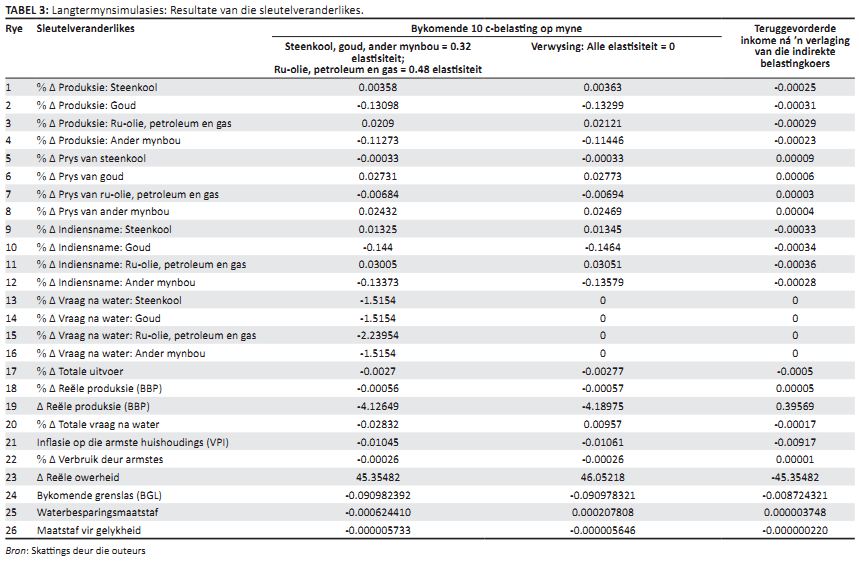 ’n Soortelyke skok van tien sent bykomende belasting per kubieke meter mynwater is in hierdie afdeling van die studie op die model toegepas om die uitwerking daarvan op die lang termyn te bestudeer. Die langtermynresultate word in Tabel 3 opgesom. Hier behoort daarop gelet te word dat die aannames rakende die produksiefaktore tussen die kort- en langtermynskattings verskil. Op die lang termyn kan faktore verander, terwyl kapitaalvoorraad byvoorbeeld op die kort termyn konstant is. Op die lang termyn kan kapitaalgoedere en -toerusting sodanig aangepas word dat dit die hoogste winste sal verseker, terwyl die betalingsbalans moontlik weer op die lang termyn konstant kan wees. Veranderings in die verskillende teikenveranderlikes word steeds as ’n persentasie uitgedruk.