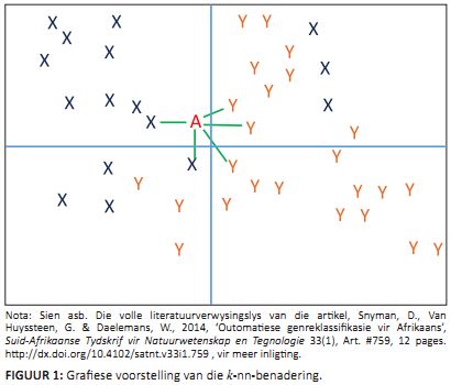 Die k-naastebuurpuntbenadering (k-nn-benadering, Khan et al. 2010) is ’n geheuegebaseerde leermetode wat gebruik word om die ooreenkoms tussen onbekende tekste en die afrigtingsgevalle te bepaal. Die algoritme stel eienskappe wat uit die afrigtingsdata onttrek word in ’n multidimensionele ruimte voor. Die ruimte word dan ingedeel in verskillende areas wat deur die afrigtingsdata se klasse bepaal word. Wanneer ’n onbekende teks geklassifiseer moet word, word die teks ook as ’n punt in die ruimte gestip aan die hand van die betrokke teks se eienskappe. Die afstand tussen die onbekende teks en die k-naaste omliggende punte word dan bepaal (sien Figuur 1). Die mees frekwente klas onder die k-naastebuurpunte word vervolgens toegeken as die klas van die onbekende teks. Die k-nn-benadering is effektief en maklik implementeerbaar en vaar goed by klassifikasieprobleme met ’n wye reeks klasse. Die benadering is egter baie sensitief vir irrelevante eienskappe en uitskieters, en die teenwoordigheid hiervan in die afrigtingsdata kan die prestasie van die benadering ernstig benadeel (Khan et al. 2010).