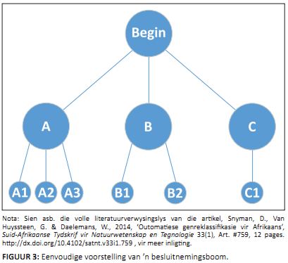 Besluitnemingsbome (Khan et al. 2010) kan gesien word as ’n versameling if-then-stellings wat in ’n hiërargiese boomstruktuur geïmplementeer word. Die eienskappe van die afrigtingsdata word in die takke van die boomstruktuur weergegee. Die pad vanaf die oorsprong van die boom na die blaarnode word bepaal deur ’n reeks waar-of-vals-vrae te volg. Die blaarnode van ’n besluitnemingsboom dui dan die klas vir die betrokke teks aan. Die pad wat deur die boom gevolg word van die wortelnode af tot by die spesifieke blaarnode, word bepaal deur die eienskappe van die teks. ’n Eenvoudige boomstruktuur word in Figuur 3 voorgestel.