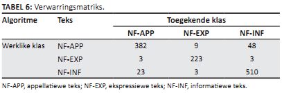 Vervolgens kan MNB en SVM, afgerig met drie klasse, as die optimale kombinasie van algoritmes en hoeveelheid klasse geïdentifiseer word om as die basis vir die hieropvolgende eksperimente te dien. Ten slotte word enkele opmerkings voorgehou oor die foute wat tydens klassifikasie gemaak word. Die wyse waarop die optimale klassifiseerder met die verskillende klasse omgaan, word geanaliseer aan die hand van die klastoekennings wat deur die algoritme gemaak word. Die outomatiese klastoekennings word in ’n verwarrings matriks (Tabel 6) voorgehou.