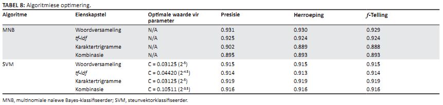 TABEL 7: Resultate vir steunvektorklassifiseerder en multinomiale naïewe Bayes-klassifiseerder met verskillende eienskappe.