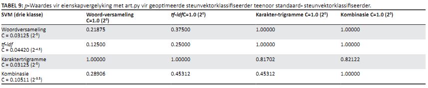 TABEL 9: p-Waardes vir eienskapvergelyking met art.py vir geoptimeerde steunvektorklassifiseerder teenoor standaard- steunvektorklassifiseerder.
