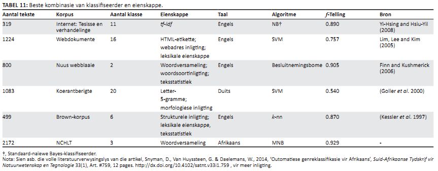Uit die bogenoemde eliminerende eksperimente word MNB geïdentifiseer as die beste algoritme, met ’n woordversamelingbenadering as die beste benadering tot eienskaponttrekking (geïdentifiseer met ’n resulterende f-telling van 0.929, sien Tabel 8). Daar kon egter nie bewys gelewer word dat die benadering statisties beduidend beter as die SVM-algoritme of die ander benaderings tot eienskap voorstelling is nie. Enige van dié benaderings kan dus gebruik word om ongeveer dieselfde resultate te verkry (in ag genome al die veranderlikes wat by die prestasie ’n rol speel) en dat die identifisering van die beste benadering dan gebaseer word op die uiteindelike f-telling. Vervolgens wil ons bepaal of die resultate wat in hierdie artikel verkry is met soortgelyke genreklassifiseerders vir ander tale kan vergelyk. Die resultate vir die optimale klassifiseerder word hieronder in Tabel 11 saam met klassifiseerders vir ander tale uit die literatuur gelys. Hieruit kan gesien word dat die resultate in hierdie artikel goed vergelyk, ondanks die beperkings wat deur ’n hulpbronskaars omgewing gestel word. Daar moet egter gelet word dat die resultate van die klassifiseerders almal op verskillende hoeveelhede klasse, afrigtingsdata, toetsstelle en algoritmes gebaseer is en dat dit alles ’n invloed het op die uiteindelike resultate wat gelewer word. Klassifikasiesisteme kan nie volledig vergelyk word tensy hulle op dieselfde toetsstel geëvalueer word nie. Die voorbeelde uit die literatuur word daarom slegs daargestel om as verwysing te dien vir die klassifiseerder wat hierbo geïdentifiseer is, maar behoort steeds van waarde te wees ten einde ’n mate van vergelyking te verskaf. Wanneer die resultate uit die literatuur vergelyk word met die klassifiseerder, word daar opgemerk dat die prestasie vir die sisteme vergelykbaar is en dat die optimale klassifiseerder in al die gevalle beter presteer.