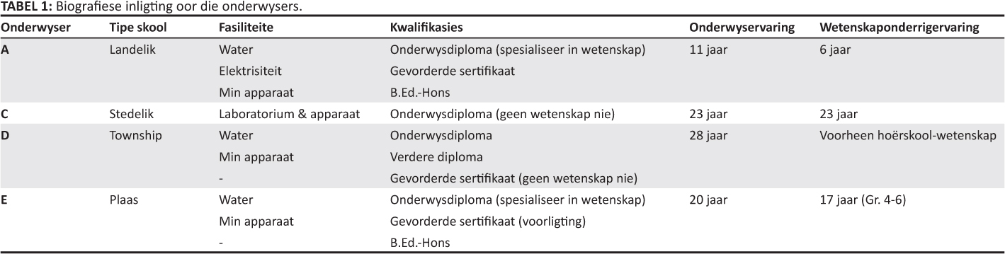Die steekproef van skole wat in hierdie studie gebruik is, bestaan uit ’n diverse stedelike skool, ’n skool in ’n informele nedersetting, ’n skool in ’n landelike gebied, asook ’n plaasskool. Die deelnemers was ervare onderwysers met tussen 11 en 28 jaar onderwyservaring. Al die deelnemers het onderwysdiplomas as eerste kwalifikasie, maar slegs onderwysers A en E het in wetenskap gespesialiseer. Hoewel almal later bykomende kwalifikasies verwerf het, was geen van hierdie bykomende kwalifikasies in wetenskaponderrig nie. Hoewel al die onderwysers gedurende hulle loopbane kort kursusse in wetenskap bygewoon het, het twee van hulle (onderwysers C en D) geen formele kwalifikasies in natuurwetenskaponderrig nie. Die inligting word in Tabel 1 opgesom.