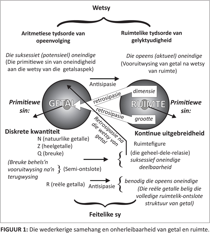 Figuur 1 wat handel oor die uniekheid en samehang tussen getal en ruimte kan in ’n sekere sin dien as ’n kernagtige opsomming van die sistematiese gesigspunte wat uit die geskiedenis na vore getree het. Die onderskeiding tussen wetsy en feitelike sy word beliggaam in die tydsordes van opeenvolging en gelyktydigheid en hierdie tydsordes korreleer met verskillende getaltipes (natuurlike getalle, heelgetalle, breuke en reële getalle) en met die feitlike ruimtelike geheel-dele-relasie. As al die dele van ’n ruimtefiguur nie gelyktydig (opeens) aanwesig is nie, bestaan dit nie in sy geheel nie. Die erkenning van hierdie twee tydsordes vorm die basis van wat tradisioneel as die potensieel en die aktueel oneindige beskou is, maar wat intuïtief duideliker aangedui sou kon word as die suksessief oneindige (dink aan die uitspraak van Kant was hierbo aangehaal is) en die opeens oneindige. Die sonderlinge verhaal wat die geskiedenis oor die aard van kontinuïteit en diskontinuïteit in die wiskunde vertel, is dat steeds heen en weer beweeg is tussen die strewe om alles vanuit ’n getalsperspektief of vanuit ’n ruimteperspekief te verklaar sonder dat die alternatief wat in die diagram vervat is, oorweeg is: aanvaar die uniekheid en onherleibaarheid van diskreetheid en kontinuïteit (getal en ruimte) en ondersoek dan op daardie basis hul wederkerige samehang.