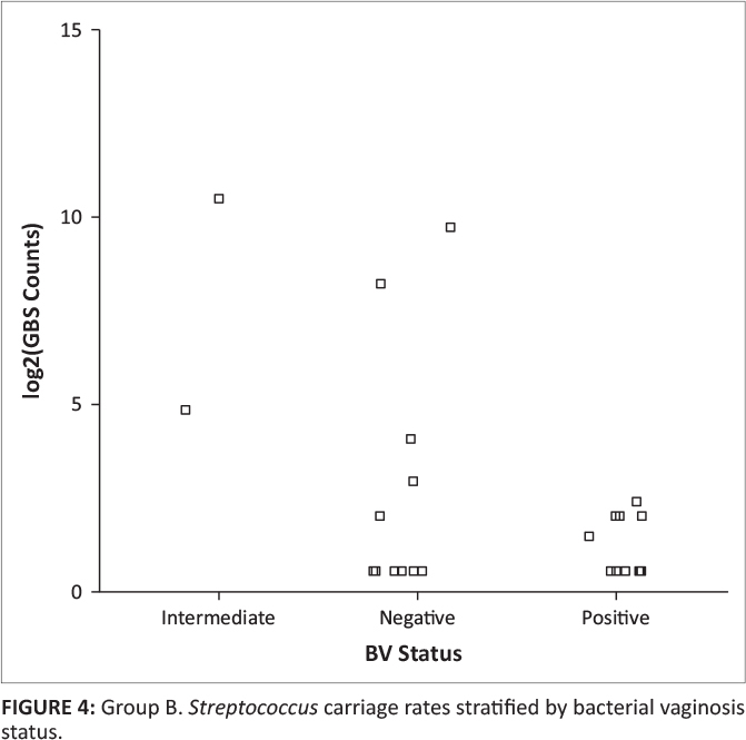 Group B Streptococcus colonisation rates vary widely, occurring in ~12% – 22% of women in developed and developing countries (Stoll & Anne 1998), with rates of 0% and 23% reported among adolescent and adult South African women, respectively (Cools et al. 2016). We found no difference in the frequency of GBS colonisation by BV status; however, BV-negative women colonised by GBS did have significantly higher levels of GBS compared with BV-positive women. GBS abundance has previously been shown to be positively associated with increased risk of adverse birth outcomes. Cools et al. (2016) found BV-negative women to be more frequently colonised by GBS; Ekström et al. (2013) reported a non-significant increase in GBS colonisation frequency in BV-negative (23.5%), compared with BV-positive women (17%); while Srinivasan et al. (2012) found no difference. In our study the non-Group B Streptococcus S. anginosus was also significantly more abundant in BV-negative women.