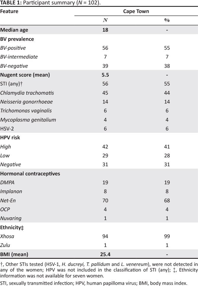 Young South African women from resource-poor communities face several sexual and reproductive health challenges. The incidence of HIV is disproportionately high in adolescent and young women in sub-Saharan Africa, relative to their male counterparts. Several factors may contribute, including lack of sexual and reproductive health education and inadequate public health services. One important additional HIV risk factor that appears to be unrelated to behaviour is genital inflammation (Masson et al. 2015). Several factors have been proposed to cause genital inflammation, including bacterial vaginosis (BV) (characterised by increased vaginal microbial diversity and a decrease in the proportion of Lactobacilli) and sexually transmitted infections (STIs). These factors appear to be interdependent, as BV is associated with increased risk of STIs (Balkus et al. 2014; Gallo et al. 2012; Wiesenfeld et al. 2003), including HIV (Atashili et al. 2008; Myer et al. 2005; Taha et al. 1998), and vice versa (Gallo et al. 2012). BV is more prevalent in women of African descent, compared to European women (Buvé et al. 2014; Ravel et al. 2010; Srinivasan et al. 2012), with extremely high rates in South Africa (34% – 58%), relative to other countries (Kenyon, Colebunders & Crucitti 2013).