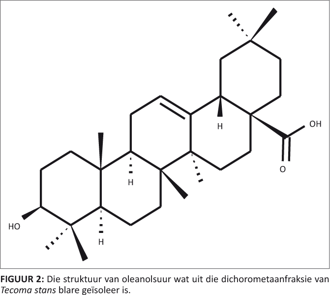 Die verbinding is as ’n wit presipitaat geïsoleer. NMR-spektroskopie het die verbinding as oleanolsuur geïdentifiseer (Figuur 2 en Figuur 1-A1). Oleanolsuur is ’n triterpenoïed verbinding wat in die blare en bas van baie plantsoorte teenwoordig is. Hierdie isomeer van ursolsuur is bekend daarvoor dat dit lewerbeskermende, anti-inflammatoriese en antihiperlipidemiese eienskappe het. Daar is ook onlangs bevind dat dit die bevordering van tumors teenwerk. Dit word in Sjina as ’n orale geneesmiddel vir menslike lewerongesteldhede bemark (www.alibaba.com/product-gs/203129384/Oleanolicacid.html). Die verbinding is baie bekend, maar die literatuur bied min inligting oor die antifungus aktiwiteit daarvan. Dit is nog nie vantevore uit T. stans geïsoleer nie.
