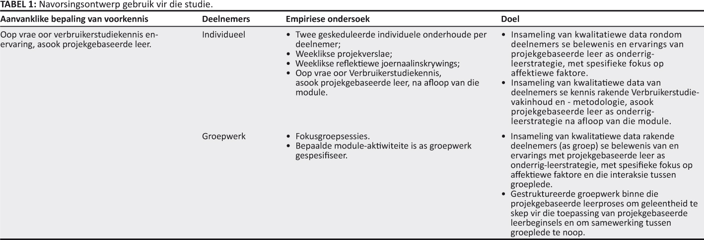 ’n Kwalitatiewe gevallestudie het as navorsingsmetode gedien. Metodes wat met die kwalitatiewe aard van só ’n studie belyn is, is gebruik vir data-insameling en -verwerking. Die navorser was direk betrokke by die data-insameling, terwyl die opinies en ervarings van deelnemers sentraal was tot die studie wat binne die spesifieke konteks van die onderwysersopleidingsmodule uitgevoer is. ’n Bestaande Verbruikerstudie-onderwysersopleidingsmodule is aangepas om hoofsaaklik projekgebaseerde leer as ’n onderrig-leerstrategie te gebruik sonder om die leerinhoud van die module te verander. Die bestaande inhoud in die module is doelgerig herrangskik in terme van volgorde, aktiwiteite en samehang om deel uit te maak van ’n projek wat gebruik is om die leerproses te struktureer. Deelnemers het bepaalde aktiwiteite as individue voltooi en ander as ’n groep. Die studie het gefokus op die ervarings van die deelnemers binne die projekgebaseerde onderrig-leerstrategie en die invloed daarvan op hul affek, eerder as op die strukturering van die module. Die navorsingsontwerp het soos volg daar uitgesien (Tabel 1).