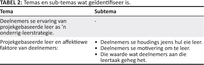 Die resultate word onder twee temas weergegee en bespreek, naamlik deelnemers se ervaring van projekgebaseerde leer as ’n onderrig-leerstrategie, gevolg deur die affektiewe faktore wat in die studie ondersoek is, soos uiteengesit in Tabel 2. Deelnemers se houdings jeens hul eie leer (positief of negatief), hul motivering om te leer (hoog tot laag), sowel as die waarde wat hulle aan die leertaak heg (hoe waardevol hulle die leer beskou het), is as affektiewe faktore (subtemas) geïdentifiseer wat tot leer bydra (sien Tabel 2). Hoewel die affektiewe faktore afsonderlik genoem word, is die resultate geïntegreerd weergegee, aangesien die faktore onlosmaaklik vervleg is.