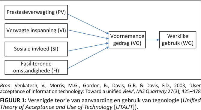 FIGUUR 1: Verenigde teorie van aanvaarding en gebruik van tegnologie (Unified Theory of Acceptance and Use of Technology [UTAUT]). |