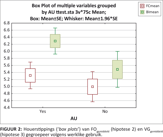FIGUUR 2: Houerstippings (‘box plots’) van FOgemiddeld (hipotese 2) en VGgemiddeld (hipotese 3) gegroepeer volgens werklike gebruik. |