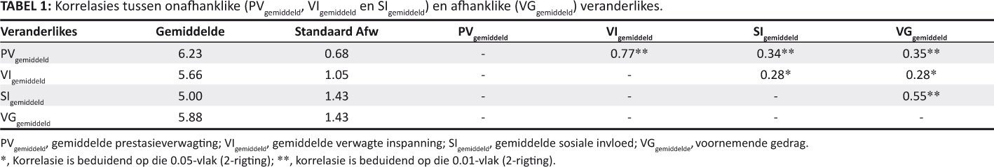 Hipotese 1 is gebruik om te toets of onderwysers se prestasieverwagting, verwagte inspanning, en sosiale invloed ’n uitwerking sal hê op hul voorneme om GeoGebra vir die onderrig en leer van Wiskunde te gebruik. Die hipotese is gestel dat daar geen verband tussen onderwysers se voorneme om GeoGebra te gebruik en hul prestasieverwagting, verwagte inspanning en sosiale invloed is nie, met die alternatiewe hipotese dat so ’n verband wel bestaan. Tabel 1 toon die korrelasies tussen die onafhanklike veranderlikes (PVgemiddeld, VIgemiddeld en SIgemiddeld) en die afhanklike veranderlike (VGgemiddeld), sowel as die gemiddeld en die standaardafwyking van elke veranderlike.
