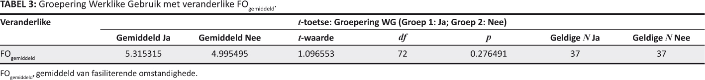 Hipotese 2 is toegepas om te toets of fasiliterende omstandighede onderwysers se werklike gebruik van GeoGebra vir die onderrig en leer van Wiskunde sal beïnvloed of nie. Die hipotese is gestel dat die bevolkingsgemiddeld van fasiliterende omstandighede (FO se gemiddeld vir beide kategorieë) dieselfde is, met die alternatiewe hipotese dat hulle verskil. Die resultate van die t-toets word in Tabel 3 aangebied.