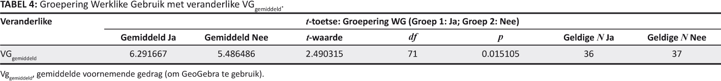 Die afhanklike veranderlike (WG – werklike gebruik) is kategories met n = 36 vir die ‘ja’-kategorie en n = 37 vir die ‘nee’-kategorie. Die ‘ja’-kategorie se gemiddeld is 6.29 en die ‘nee’-kategorie 5.49 (sien Tabel 4 en vergelyk dit met Figure 2 in die vorige gedeelte). ’n Beduidendheidsvlak van α = 0.05 is gebruik. Die p-waarde van die t (p = 0.015) vergeleke met die beduidendheidsvlak van 0.05 dui daarop dat H0 hipotese 3 ten gunste van H1 verwerp het. Dit impliseer dat daar beslis ’n statistiese verskil is tussen die VG se bevolkingsgemiddeld vir die ‘ja’- en ‘nee’-kategorieë van werklike gebruik. Hipotese 3 is dus beduidend, en daar kan met ’n 98.5% vlak van vertroue (p = 0.015) gesê word dat onderwysers se voorneme om GeoGebra te gebruik inderdaad die werklike gebruik van GeoGebra vir onderrig en leer voorspel.