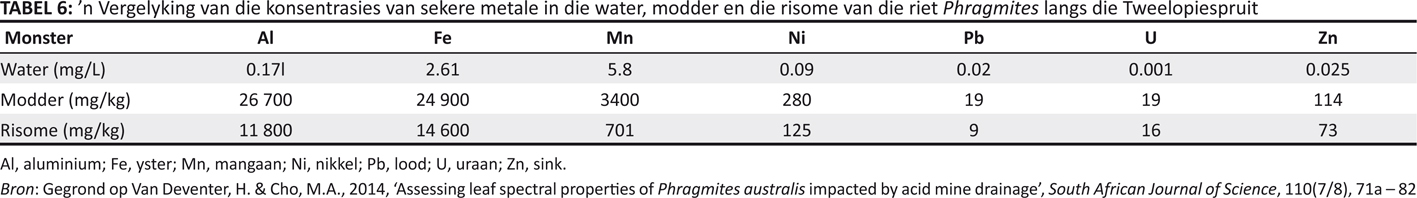 Die sulfaatsoute wat met suur mynwater in ’n dolomietryke omgewing voorkom, speel ’n groot rol in die agteruitgang van die oewerbos. Die plante wat oorspronklik op die oewer van die Tweelopiespruit voorgekom het, is grootliks deur die soutbestande Phragmites australis verplaas. Die omstandighede in Robinsonmeer het egter so agteruitgegaan dat selfs Phragmites begin vrek het (sien Figuur 3). Plante het egter die vermoë om groot hoeveelhede metale te absorbeer sonder om te vrek. In ’n onlangse studie (Van Deventer & Cho 2014) is daar gevind dat die risome van Phragmites in die Tweelopiespruit 11 800 mg/kg aluminium, 14 600mg/kg yster, 701 mg/kg mangaan, 125 mg/kg nikkel, 9 mg/kg lood, 73 mg/kg sink en 16 mg/kg uraan bevat het. Die water waarin die riete gestaan het, het egter slegs 0.17 mg/L aluminium, 2.61 mg/L yster, 5.8 mg/L mangaan, 0.09 mg/L nikkel, 0.02 mg/L lood, 0.025 mg/L sink en 0.001 mg/L uraan bevat(sien Tabel 6: ’n Vergelyking van die konsentrasies van sekere metale in die water, modder en die risome van die riet Phragmites langs die Tweelopiespruit). Die metale in die plantweefsel sal beskikbaar wees vir enige herbivoor wat die aangetaste plante eet.