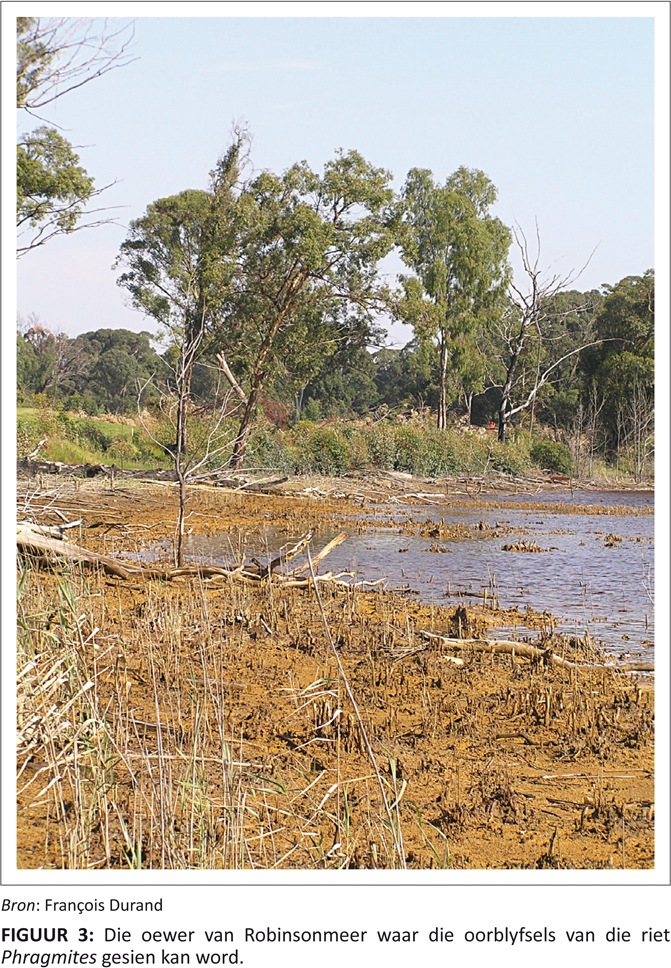 FIGUUR 3: Die oewer van Robinsonmeer waar die oorblyfsels van die riet Phragmites gesien kan word. |