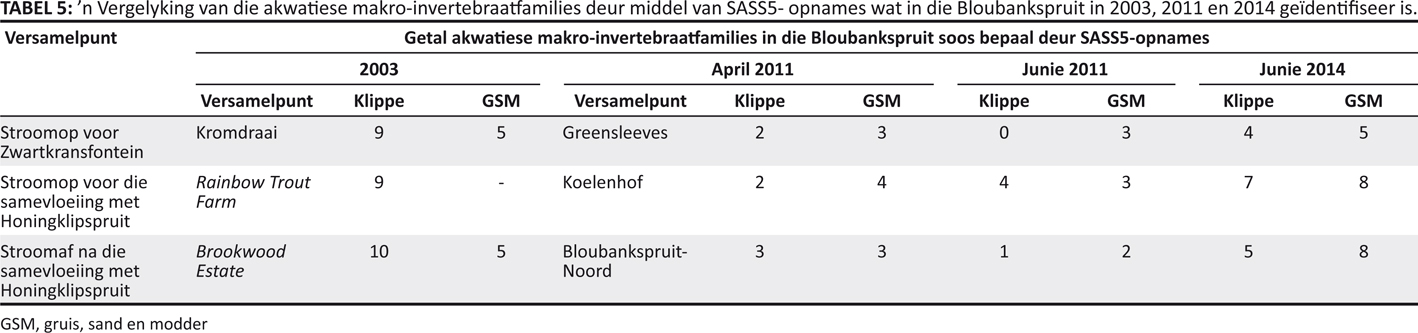 | TABEL 5: ’n Vergelyking van die akwatiese makro-invertebraatfamilies deur middel van SASS5- opnames wat in die Bloubankspruit in 2003, 2011 en 2014 geïdentifiseer is. |