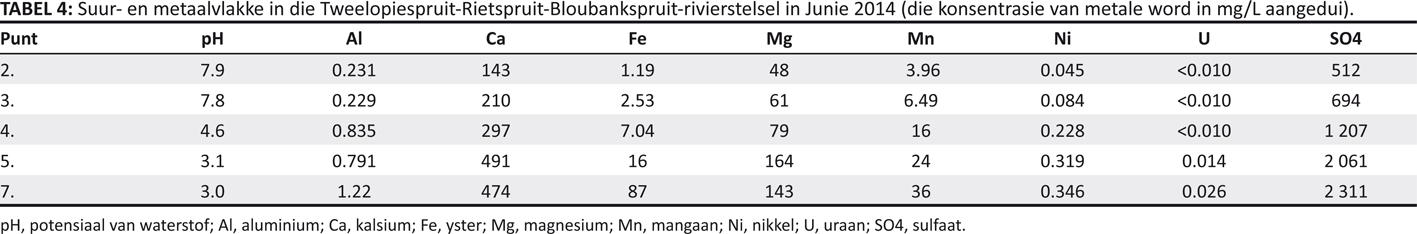 | TABEL 4: Suur- en metaalvlakke in die Tweelopiespruit-Rietspruit-Bloubankspruit-rivierstelsel in Junie 2014 (die konsentrasie van metale word in mg/L aangedui). |