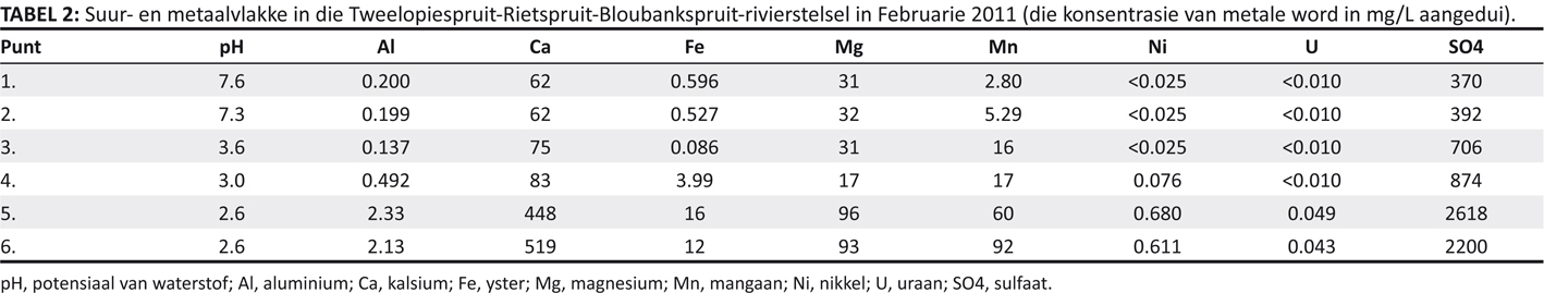 | TABEL 2: Suur- en metaalvlakke in die Tweelopiespruit-Rietspruit-Bloubankspruit-rivierstelsel in Februarie 2011 (die konsentrasie van metale word in mg/L aangedui). |