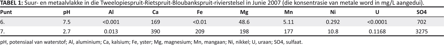 | TABEL 1: Suur- en metaalvlakke in die Tweelopiespruit-Rietspruit-Bloubankspruit-rivierstelsel in Junie 2007 (die konsentrasie van metale word in mg/L aangedui). |