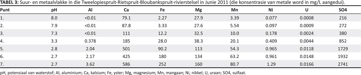 | TABEL 3: Suur- en metaalvlakke in die Tweelopiespruit-Rietspruit-Bloubankspruit-rivierstelsel in Junie 2011 (die konsentrasie van metale word in mg/L aangedui). |