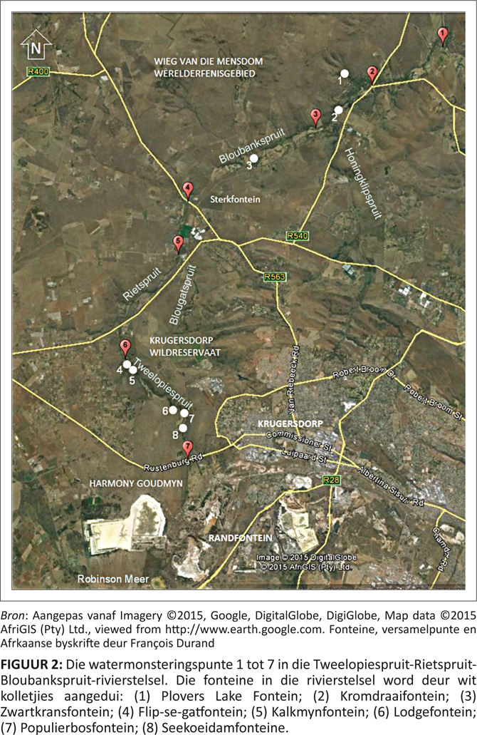FIGUUR 2: Die watermonsteringspunte 1 tot 7 in die Tweelopiespruit-Rietspruit-Bloubankspruit-rivierstelsel. Die fonteine in die rivierstelsel word deur wit kolletjies aangedui: (1) Plovers Lake Fontein; (2) Kromdraaifontein; (3) Zwartkransfontein; (4) Flip-se-gatfontein; (5) Kalkmynfontein; (6) Lodgefontein; (7) Populierbosfontein; (8) Seekoeidamfonteine. |