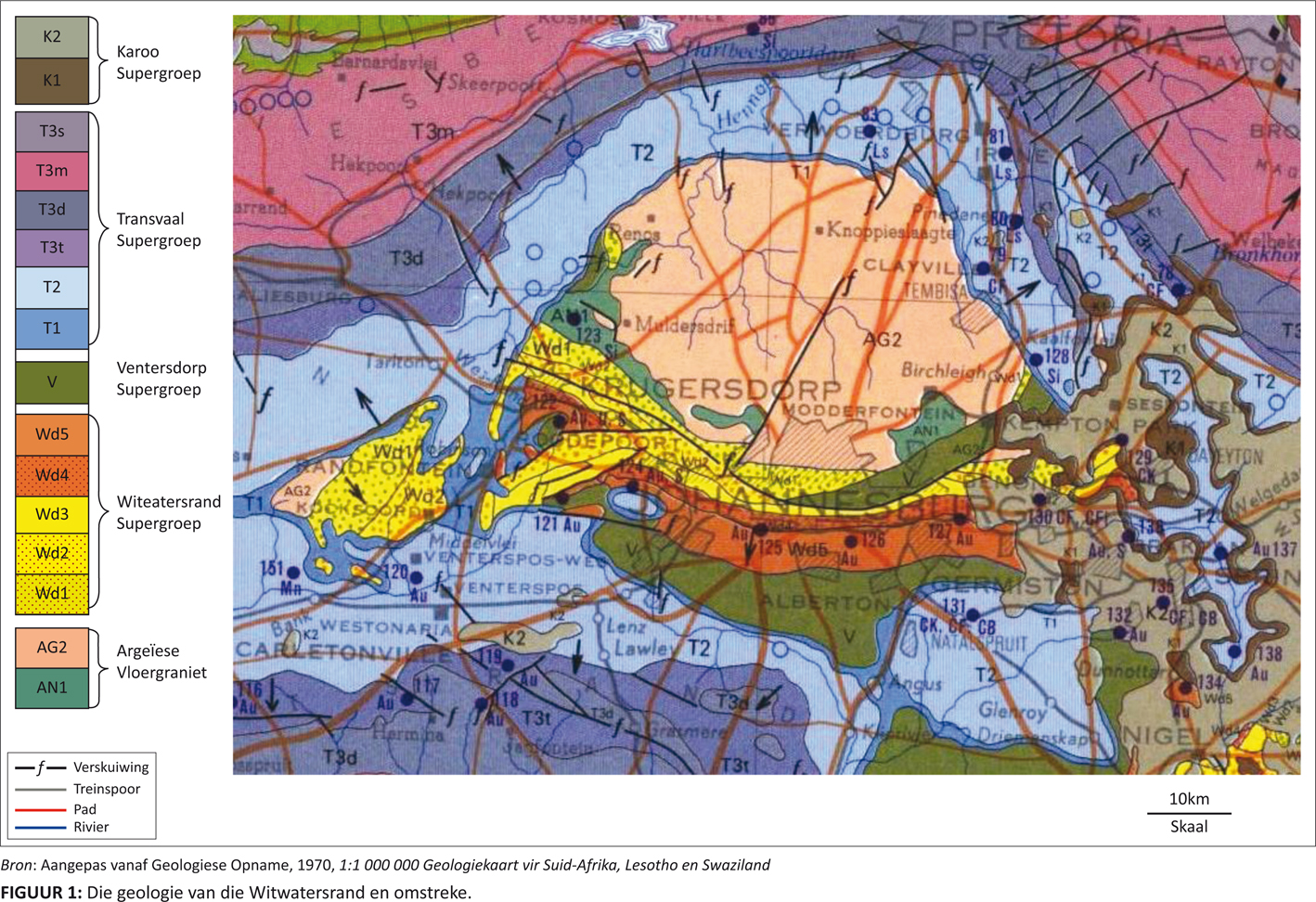 FIGUUR 1: Die geologie van die Witwatersrand en omstreke. |