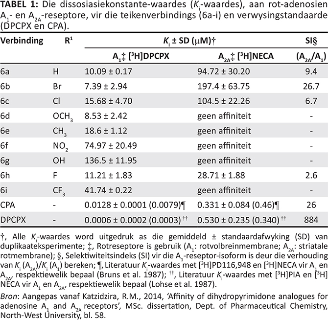 Die affiniteit van die 3,4-dihidropirimidoon-analoë (6a-i) vir die adenosien A1- en A2A-reseptorsubtipes is bepaal deur gebruik te maak van ’n radioligandbindingsprotokol wat voorheen in die literatuur beskryf is (Van der Walt et al. 2015). Die verplasing van 1,3-[3H]-dipropiel-8-siklopentielxantien ([3H]DPCPX), vanuit rot-volbreinmembrane en N-[3H]etieladenosien-5’-uronamied ([3H]NECA), vanuit striatale rotmembrane, is gemeet om onderskeidelik die adenosien A1- en A2A-bindingsaffiniteit te bepaal. Die resultate word as Ki-waardes weergegee wat uitgedruk word as die gemiddeld ± standaardafwyking (SD) en is in Tabel 1 gedokumenteer.
