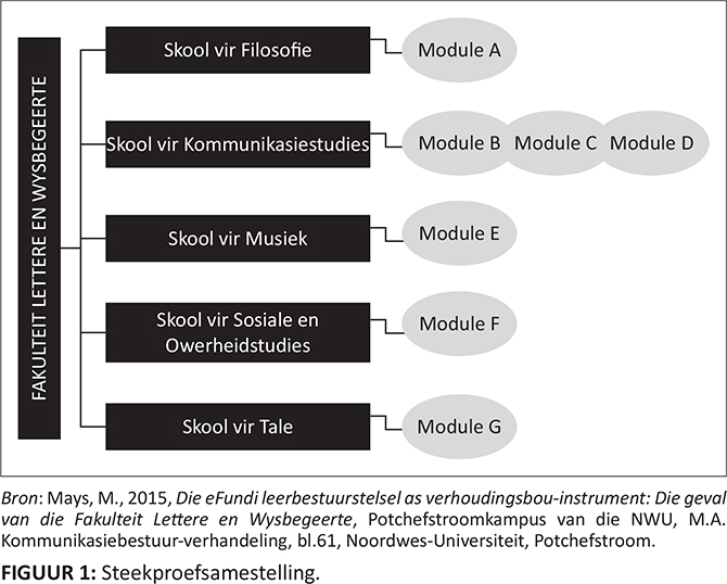Ten opsigte van die Fakulteit Lettere en Wysbegeerte as gevallestudie kan genoem word dat vyf skole binne dié fakulteit funksioneer, naamlik die Skole vir Kommunikasiestudies, Filosofie, Tale, Sosiale en Owerheidstudies en Musiek. In elke skool word vakspesifieke modules onderrig.